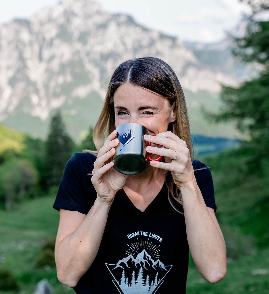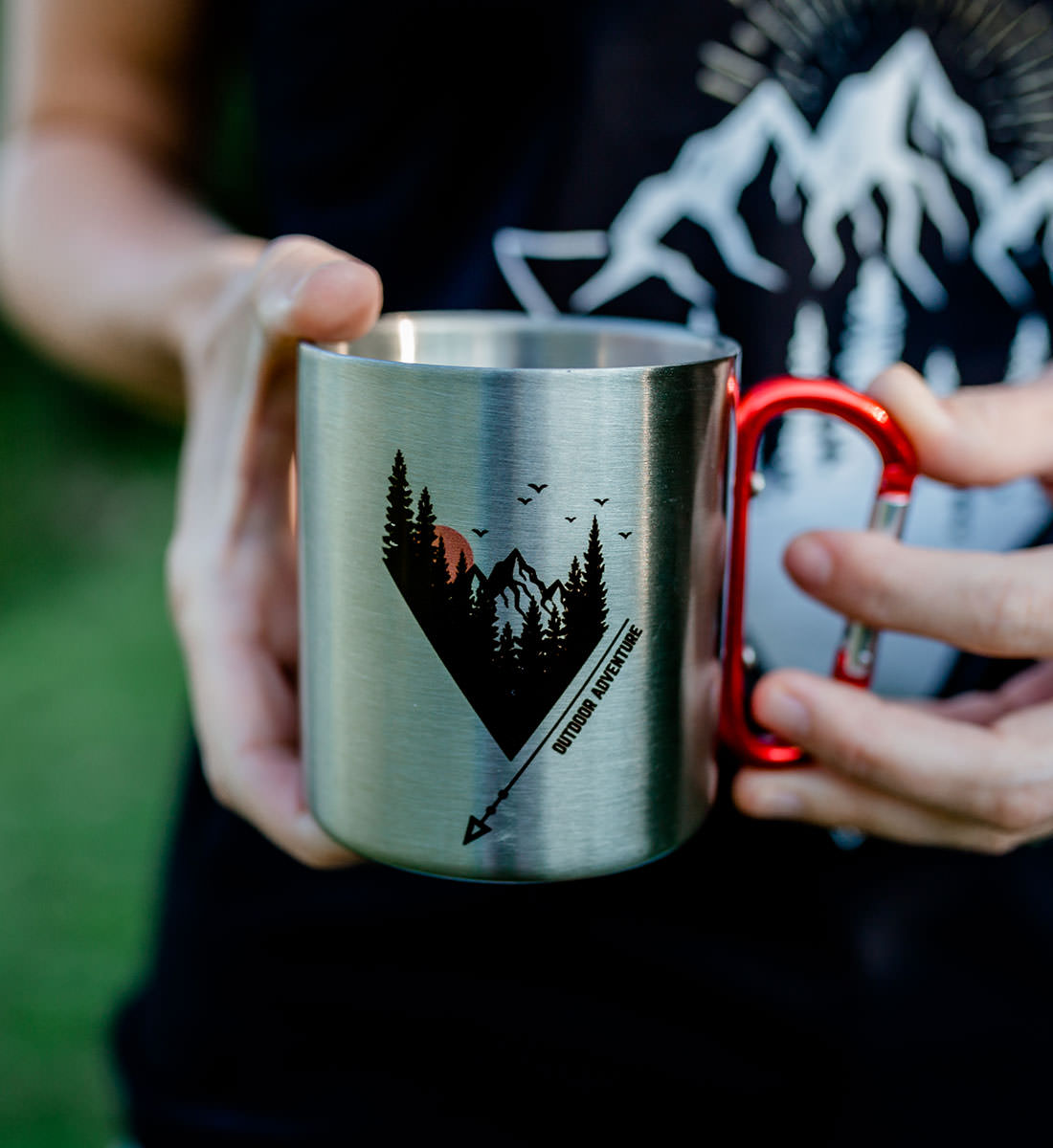 Unsere Edelstahltasse mit Karabinergriff ist die perfekte Ergänzung für dein Outdoor-Abenteuer oder Campingausflug.